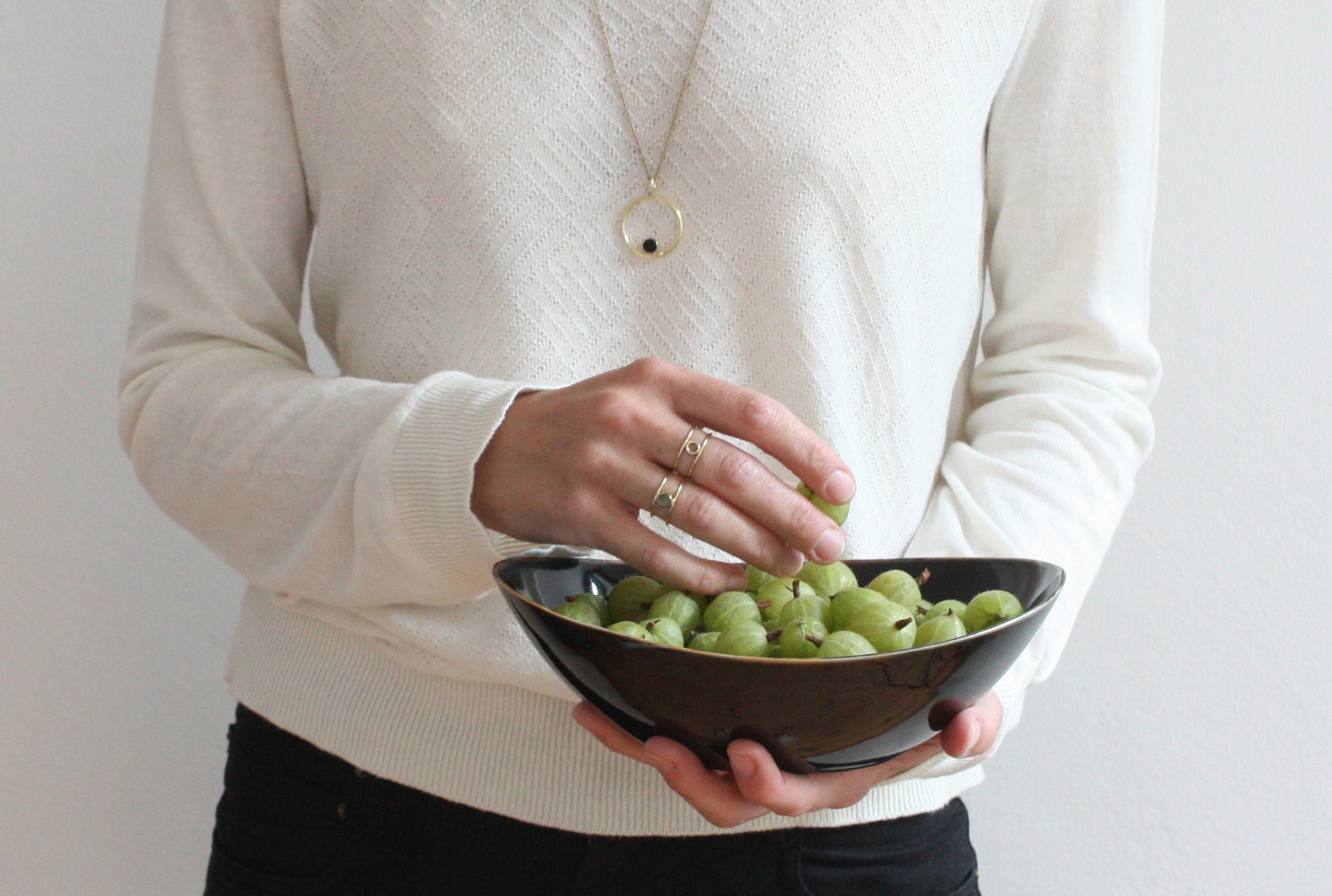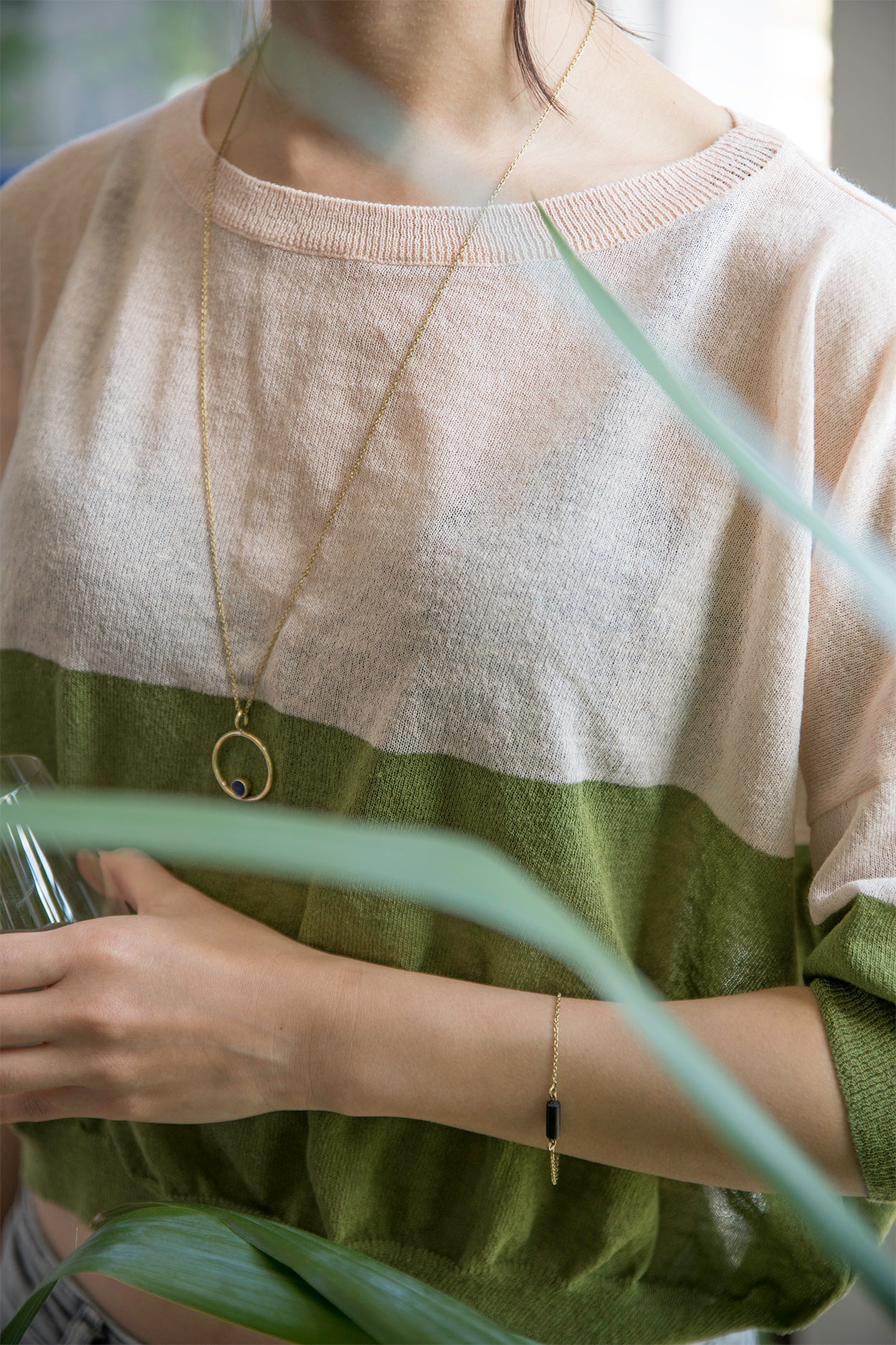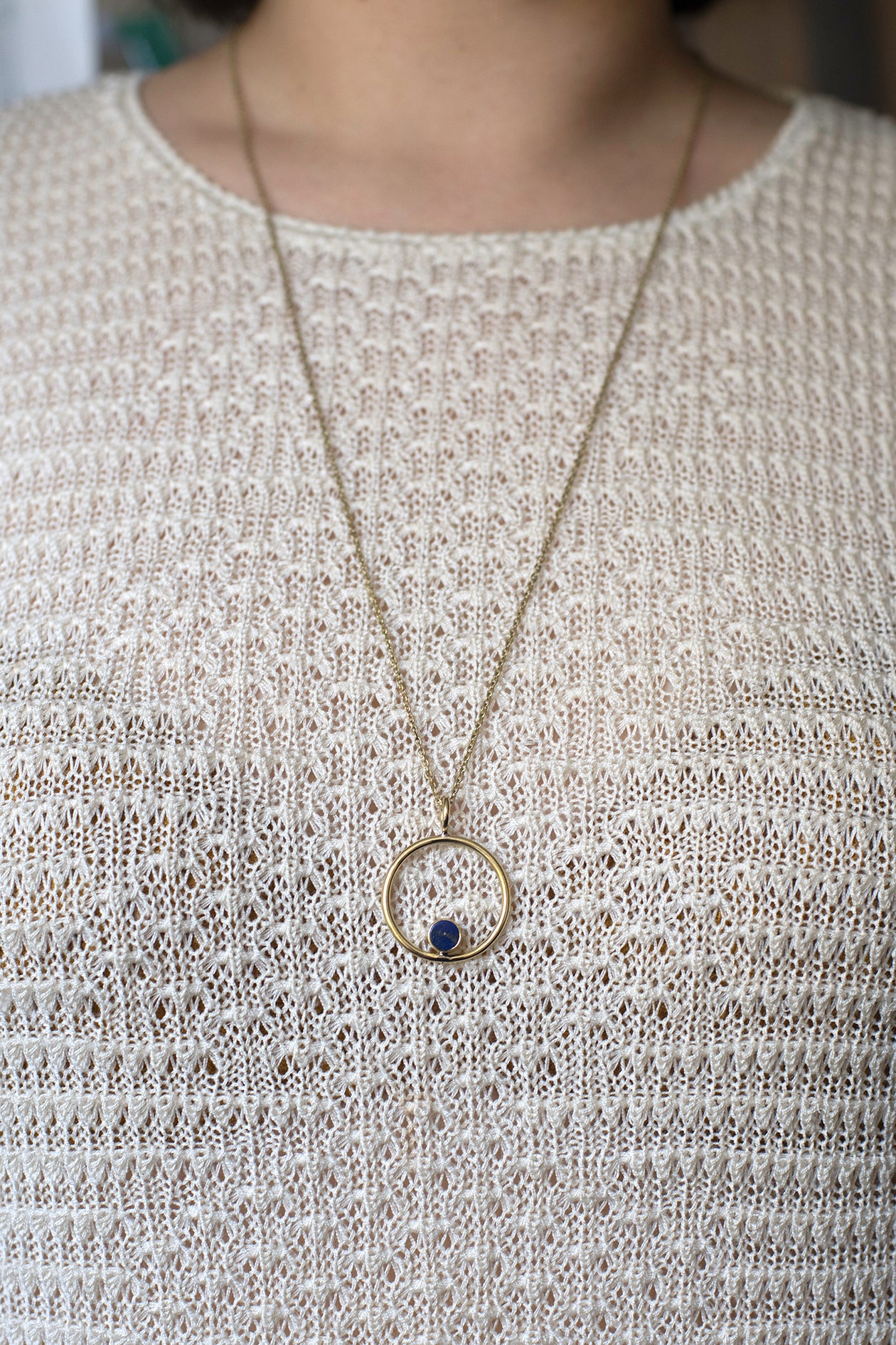 This pendant plays with different sizes of the same shape: a small dot rests at the bottom of a bigger circle. The circle is made from round brass / silver wire which adds to the general roundness of the pendant. The dot itself is a flat cut stone with a matte appearance set in a bezel with the backside being brass / silver.