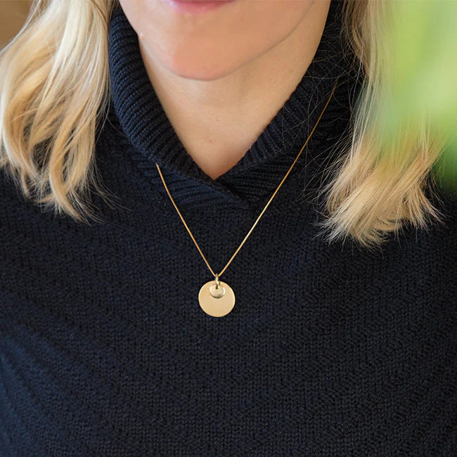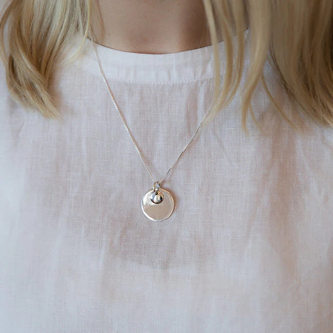 Ein schlichter Anhänger mit einer großen und einer kleinen runden Scheibe hängt an einer zarten Kastenkette. Die eher eckig anmutende Form der Kette bildet einen schönen Kontrast zu dem übereinander liegenden runden Anhänger mit seiner glatten und ruhigen Oberfläche.
