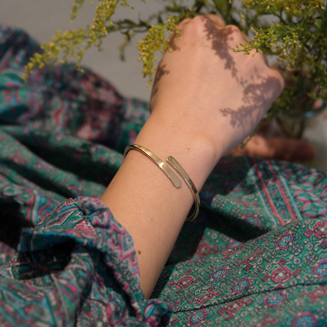 Bei diesem schlichten Armreif treffen sich die Enden des runden Messing-/ Silberdrahts nicht, sondern sind leicht versetzt und rund flach gehämmert, was für ein schönes Highlight auf der Vorderseite des Handgelenks sorgt. Um den Armreif anzuziehen müssen die zwei Seiten leicht auseinander gezogen werden, auf diesem Weg lässt sich auch die Größe leicht anpassen.