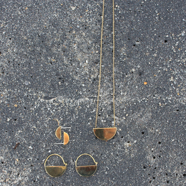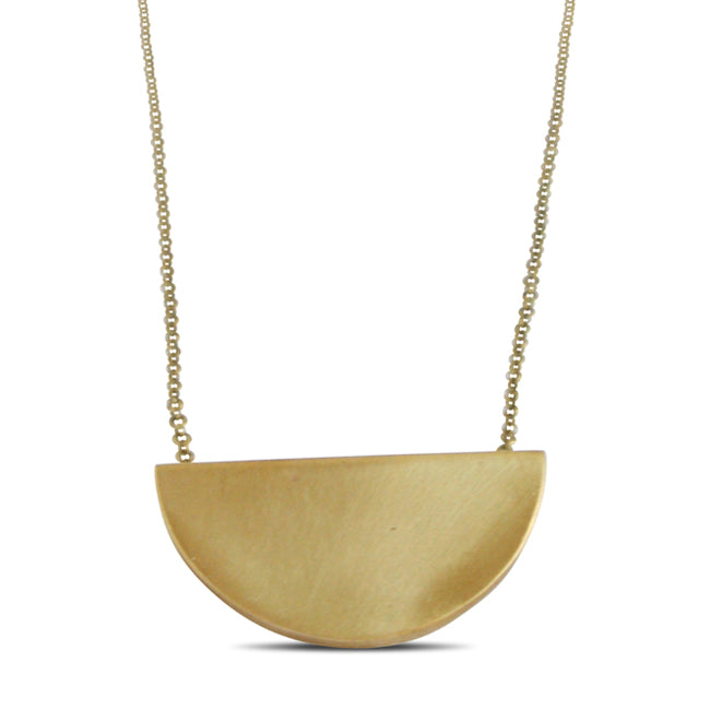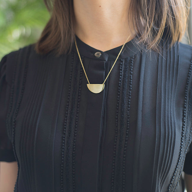 This simple necklace has a stylised half moon shape. By being attached to the chain with two little hoops on the backside the pendant rests slightly on the chest of the person wearing it.