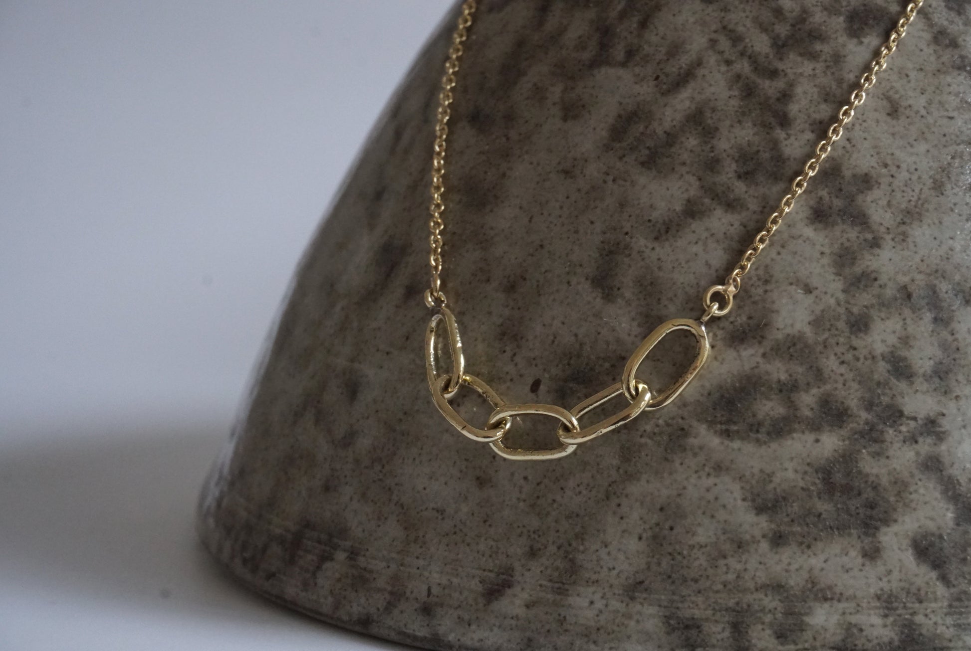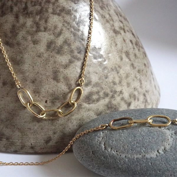 The link necklace has five hand forged chain link elements in the middle of a delicate anchor chain, closed with a fishhook closure.