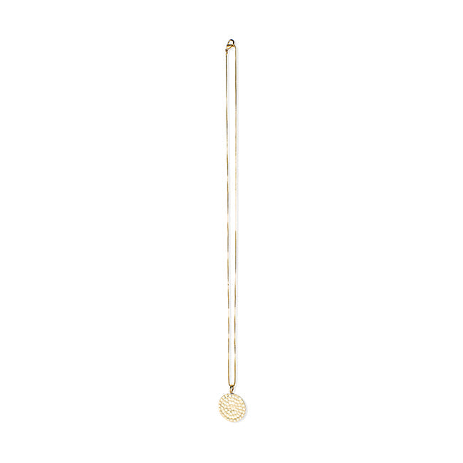 Der runde, flache von Hand gehämmerte Anhänger hängt an einer feingliedrigen Kette und erscheint durch die gehämmerte Struktur aus jedem Winkel ein wenig anders.