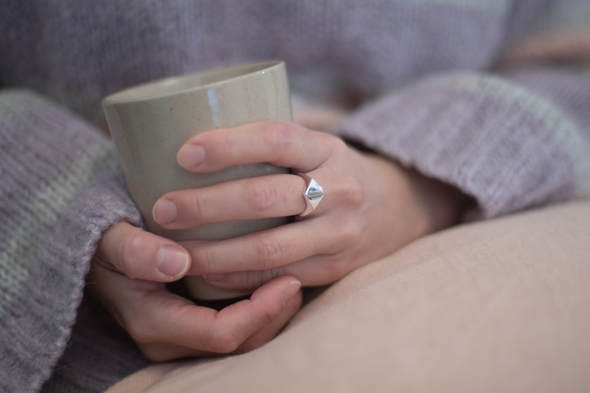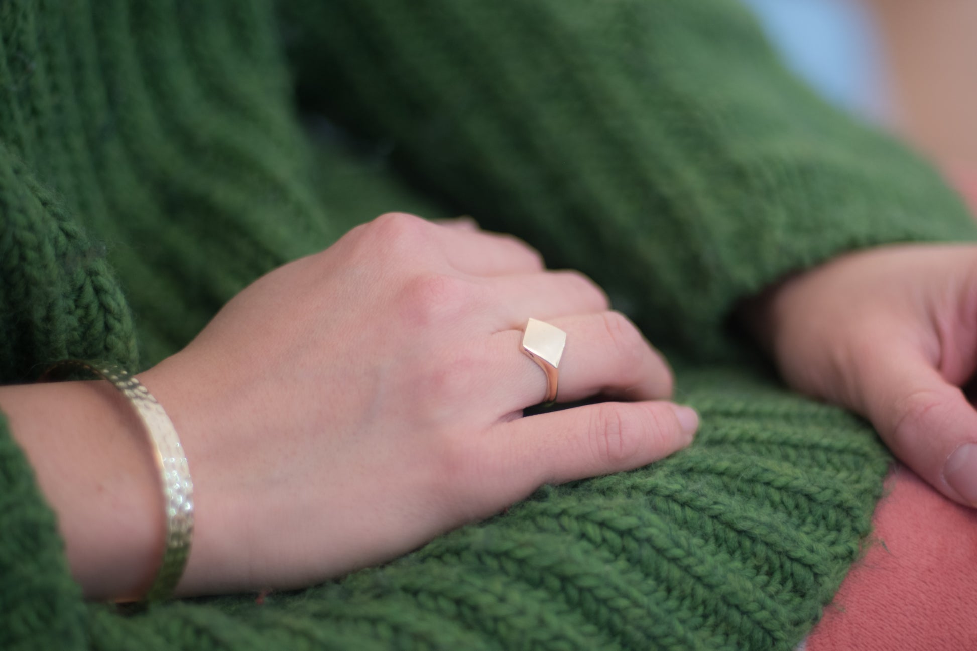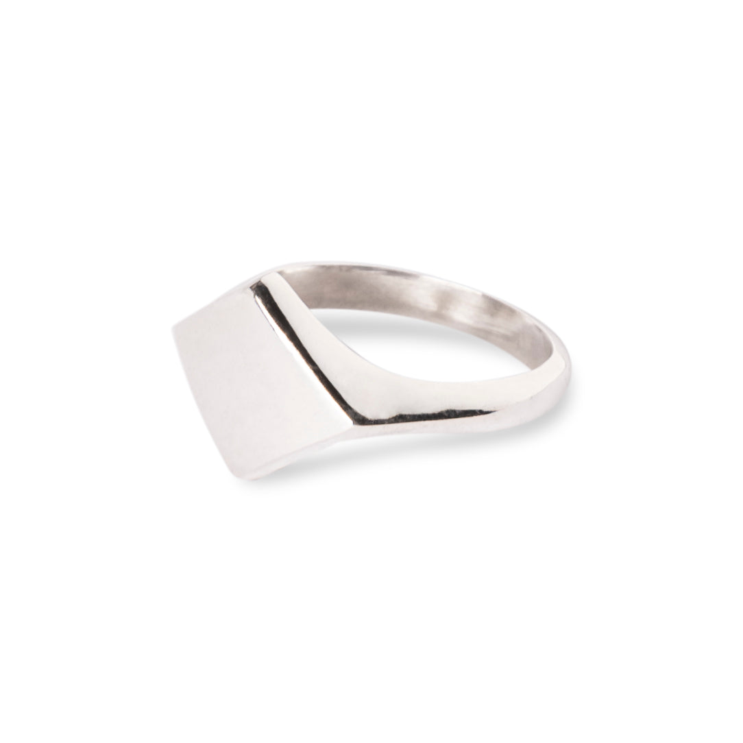 A plain version of the classic signet ring. The diamond-shape looks great all by itself on your finger.