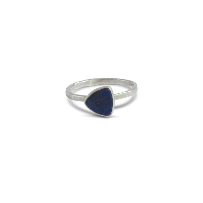 Der Stein dieses Rings hat eine abgerundete Dreiecksfrom und durch seinen flachen Schliff wirkt er weich und organisch. Dazu passt der von Hand gehämmerte, dünne Ring.