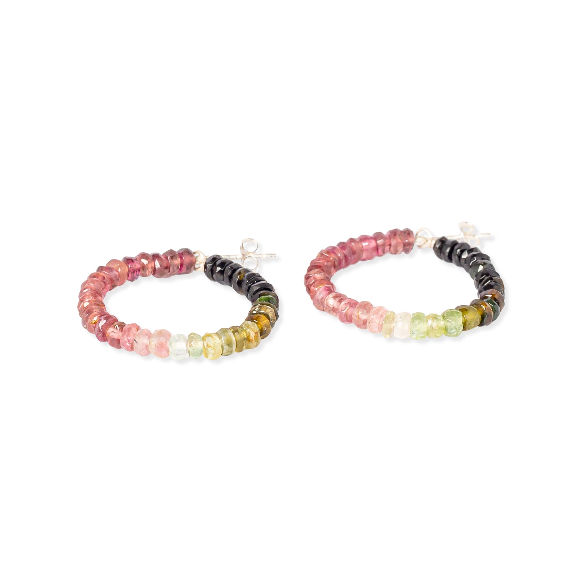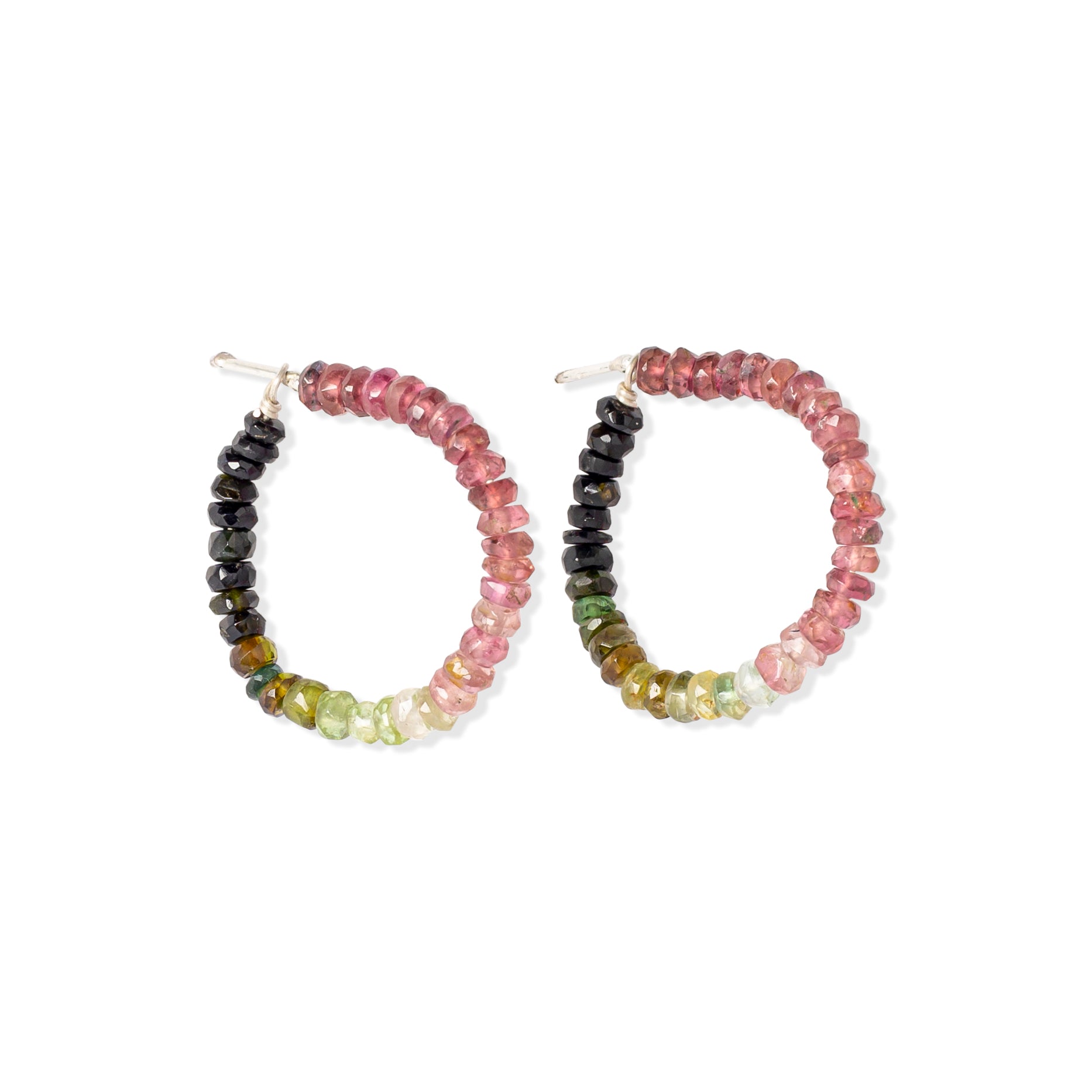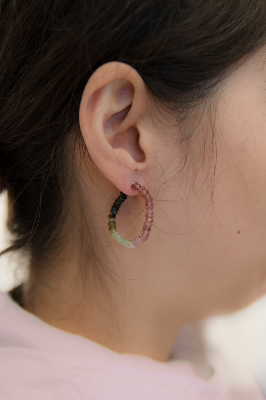 Der Star dieser Kreolen sind die verschiedenfarbigen Steine die ihnen ihren Namen geben, die Wassermelonenturmaline. Diese sind im äußeren Bereich der Kristalle grün und innen rosafarben, diesen Verlauf nehmen die kleinen Steine der Kreolen auf.
