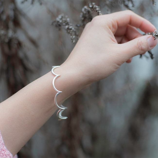A fixed-size, round bangle with small waves which reminds us of our favourite places at the water.